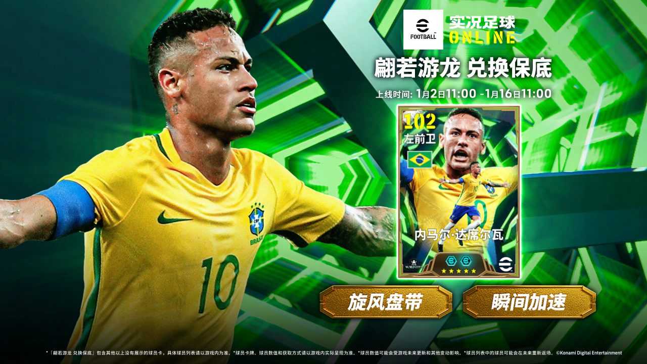 自带双特殊技能的全新双增能史诗 内马尔·达席尔瓦(特殊技能:旋风盘带、瞬间加速)和罗伯托·巴乔(特殊技能:无定型传球、旋风盘带)将通过【翩若游龙 兑换保底】首次登场!除此之外,你还将有机会获得双增能史诗 罗纳尔迪尼奥(特殊技能:瞬间加速、旋风盘带)等强力球员,以及一众精选球员,想要补强球队的玩家们千万不要错过本次活动!
