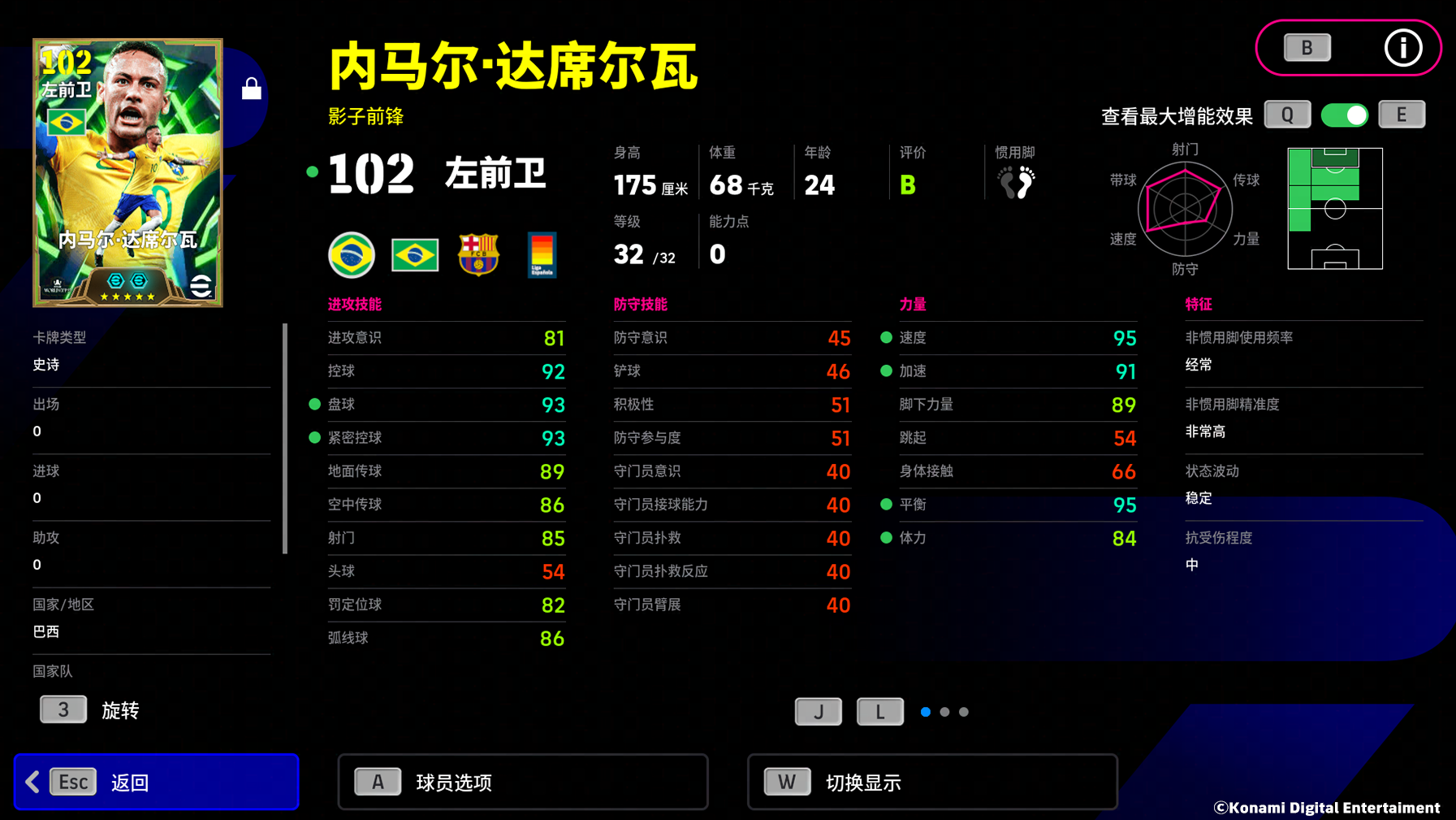 内马尔的定位球能力同样出色,不俗的罚定位球能力和弧线球数值,让他能够在实况赛场复刻当年直挂死角的任意球!