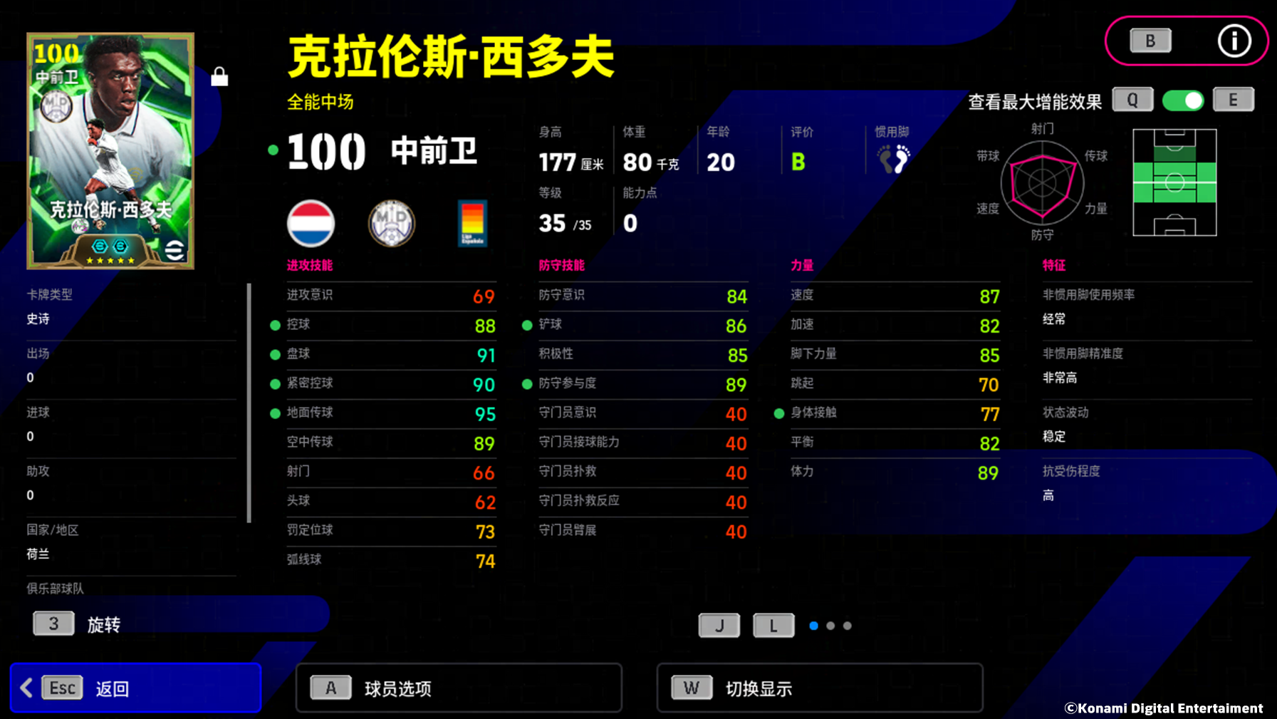 西多夫的增能属性为【反击 +3】,身体接触和地面传球的双重提升,让他成为球队反击的发起者。自带的【无定型传球】特殊技能,让他能在任何姿态下传出一记漂亮的直塞助攻队友完成破门!而他的85分的脚下力量搭配【掠地瞬击】特殊技能,让他的重炮能够响彻实况赛场!